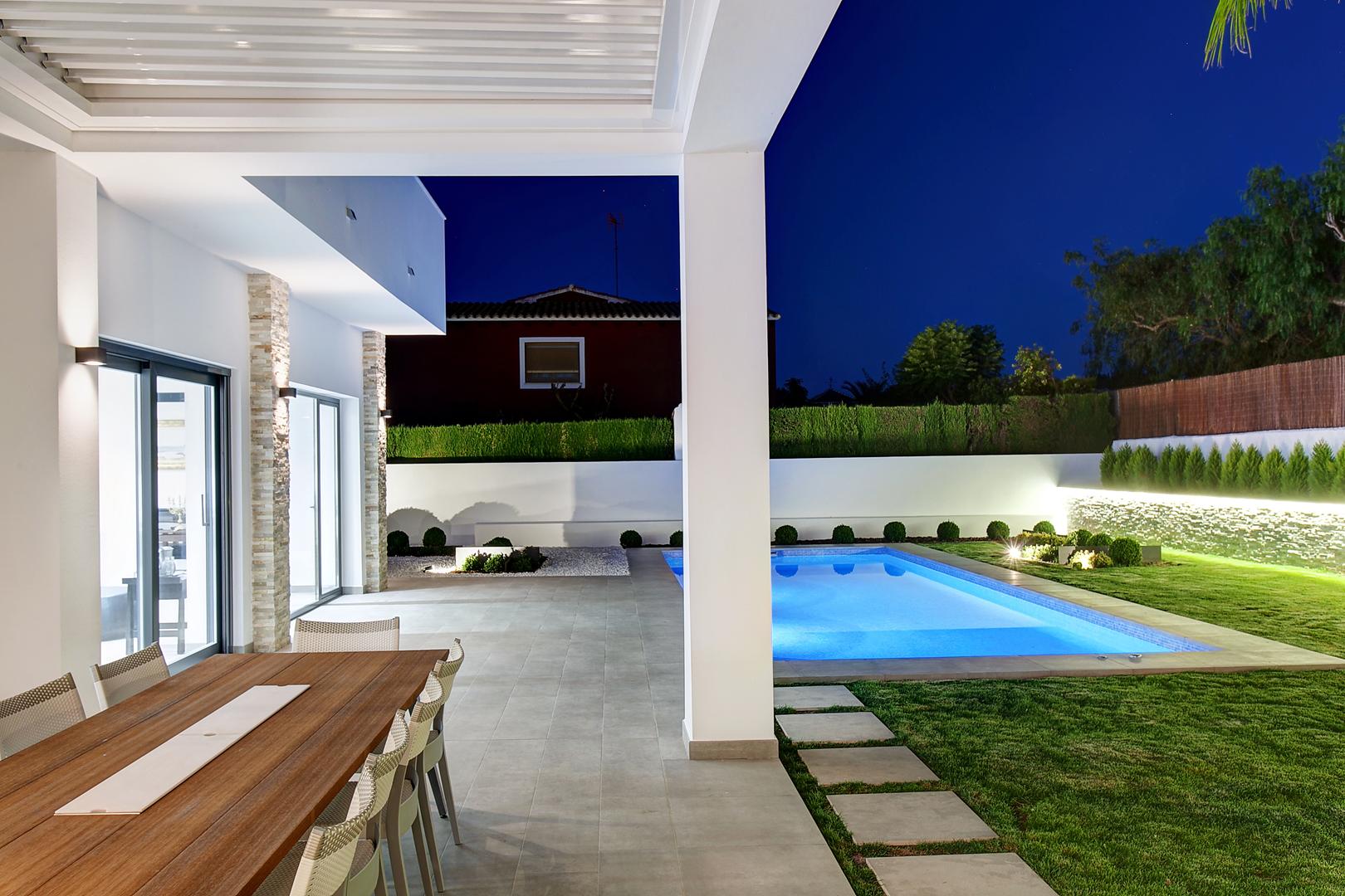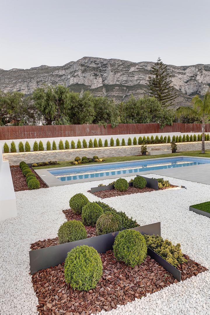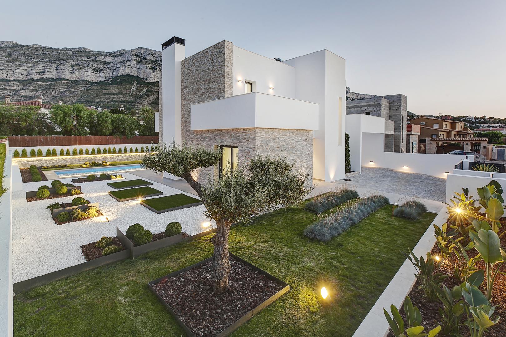 Esta moderna vivienda unifamiliar de nueva construcción se ubica en una zona tranquila y próxima al Parque Natural del Montgó, en Dénia. El diseño arquitectónico se resolvió en dos plantas para optimizar la funcionalidad y la separación de usos.