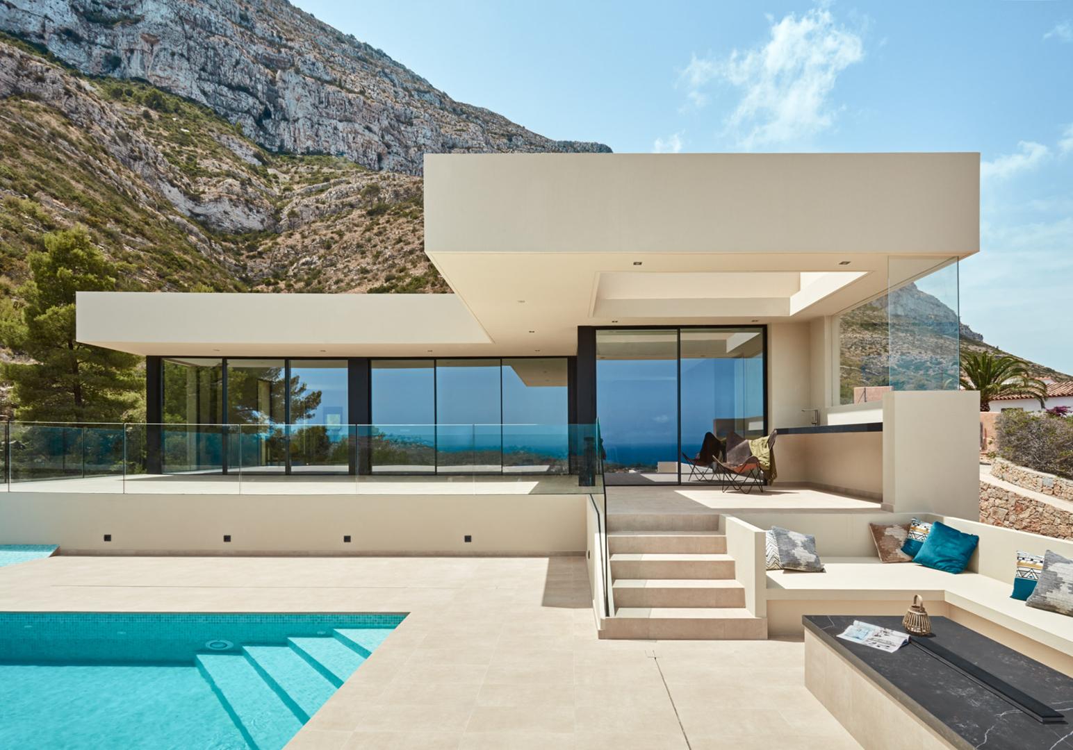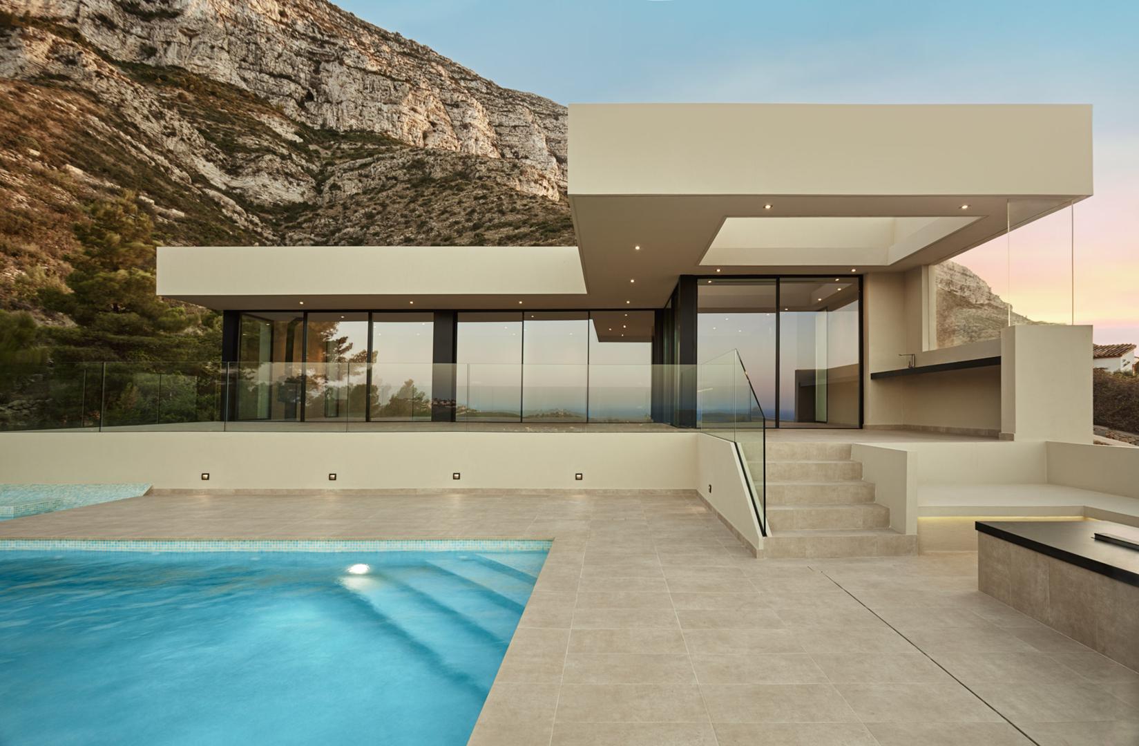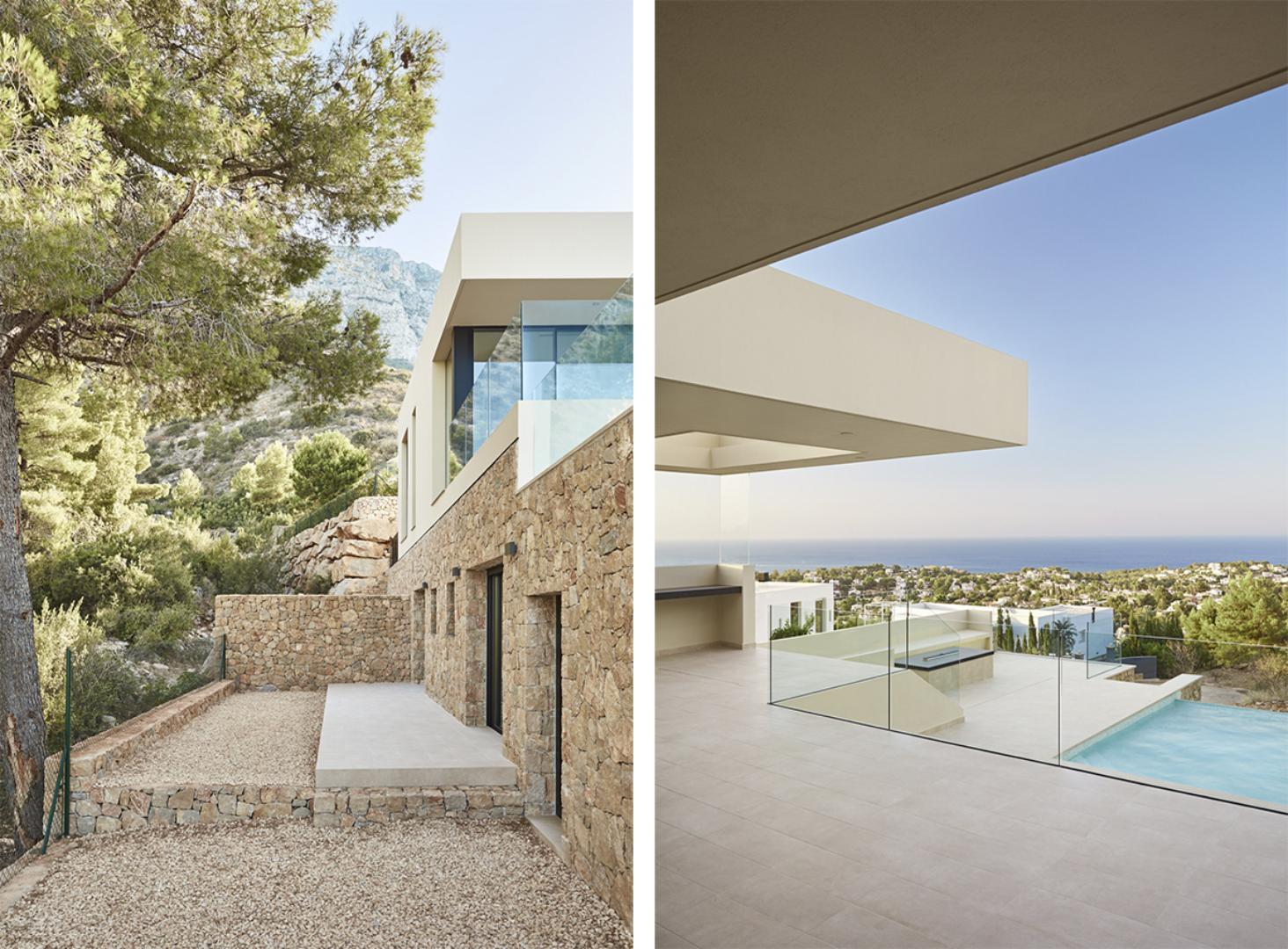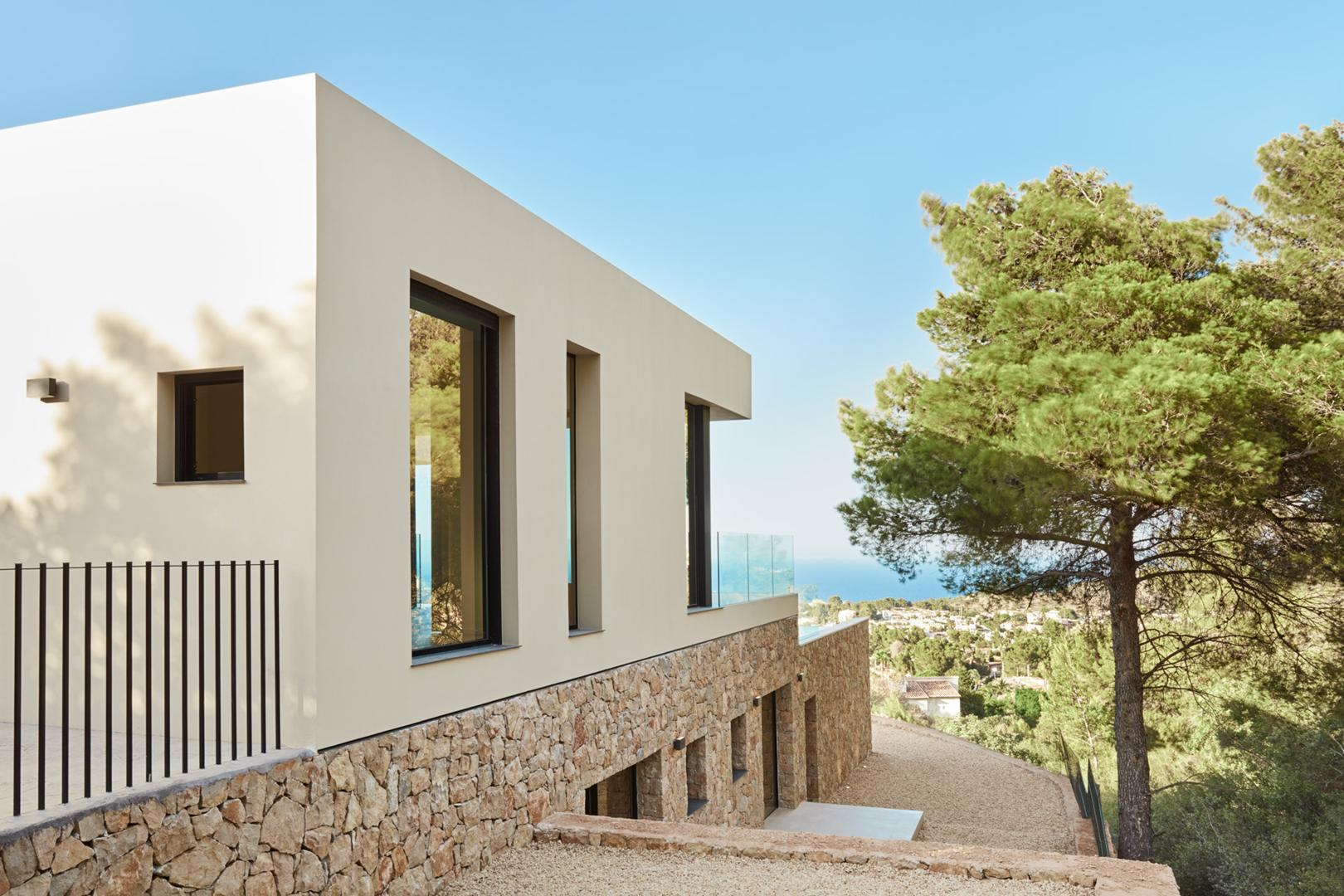 La construcción de esta villa de obra nueva se inició con un desafío topográfico significativo: la orografía de la parcela era complicada debido a su proximidad a un barranco. Para cimentar la vivienda y asegurar vistas panorámicas al mar, fue necesaria la ejecución de muros de hormigón y contención robustos, diseñados para lograr la altura requerida y garantizar la estabilidad en la ladera.