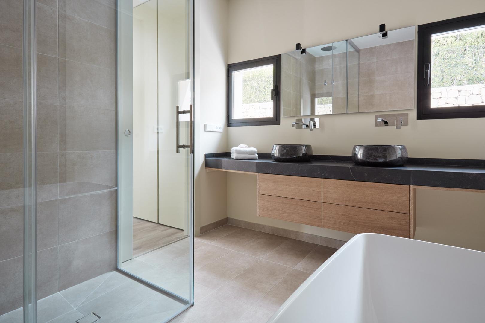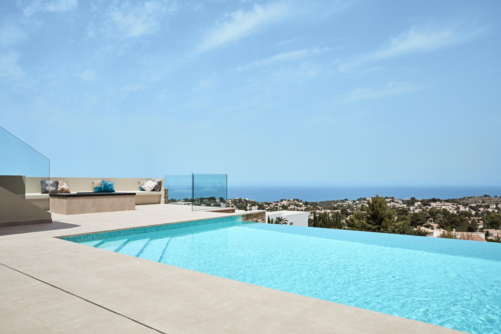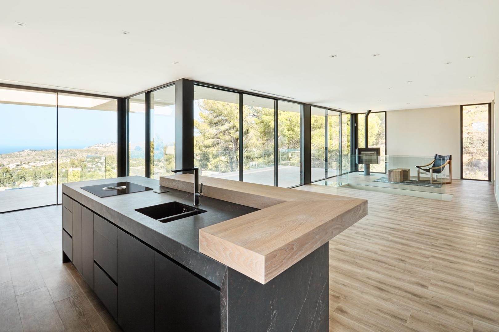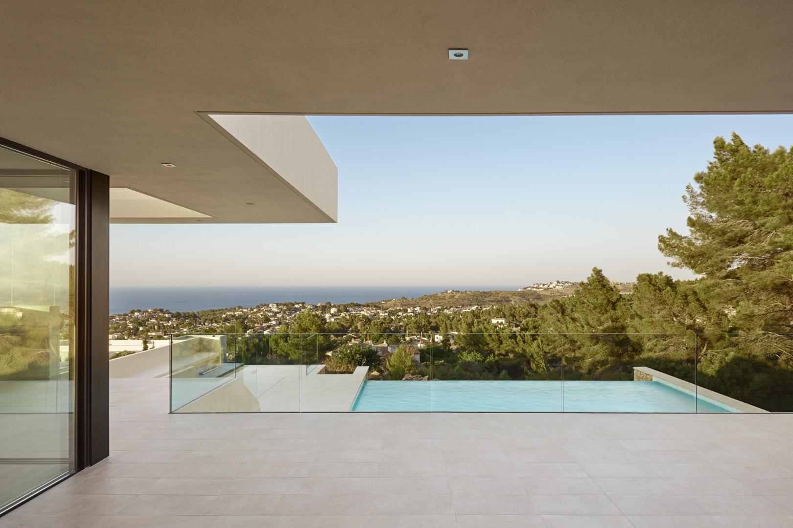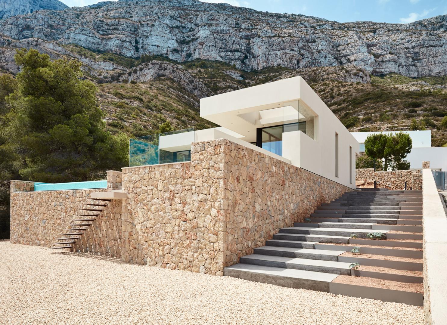 La construcción de esta villa de obra nueva se inició con un desafío topográfico significativo: la orografía de la parcela era complicada debido a su proximidad a un barranco. Para cimentar la vivienda y asegurar vistas panorámicas al mar, fue necesaria la ejecución de muros de hormigón y contención robustos, diseñados para lograr la altura requerida y garantizar la estabilidad en la ladera.