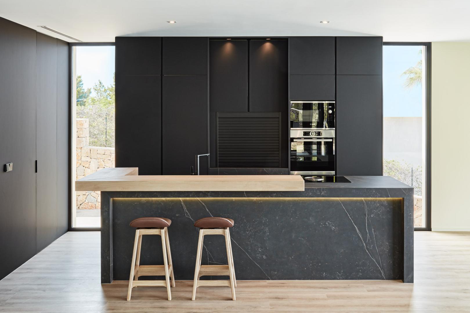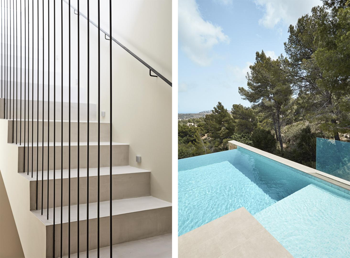 Los espacios interiores se resolvieron mediante una estructura abierta que integra salón, comedor y cocina en una unidad fluida. En el exterior, se ejecutó una piscina desbordante que acentúa las vistas al mar, cuya construcción demanda una precisión técnica en el vaso y el sistema de rebose.