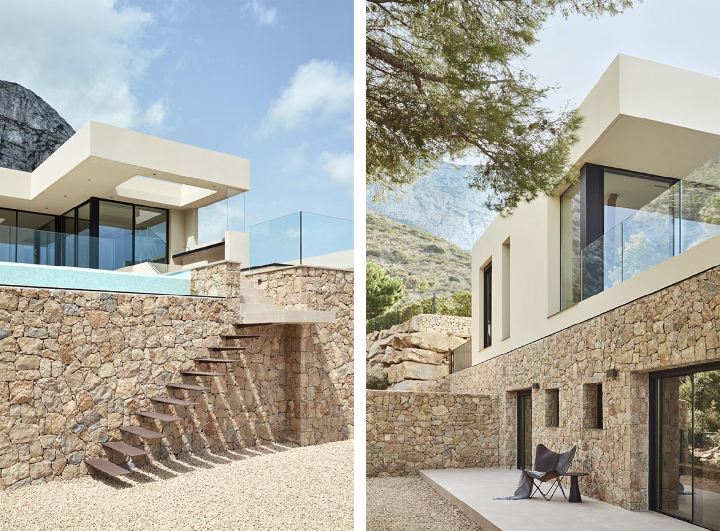 La excelencia de la ejecución se evidencia en la integración de la vivienda en el paisaje. Se utilizó la piedra natural como elemento protagonista de la fachada, aprovechando la materialidad local para establecer un diálogo con el entorno. Para maximizar las visuales al mar, se construyeron grandes ventanales que no solo enmarcan el paisaje, sino que requieren una carpintería de alto rendimiento para mantener la eficiencia energética.