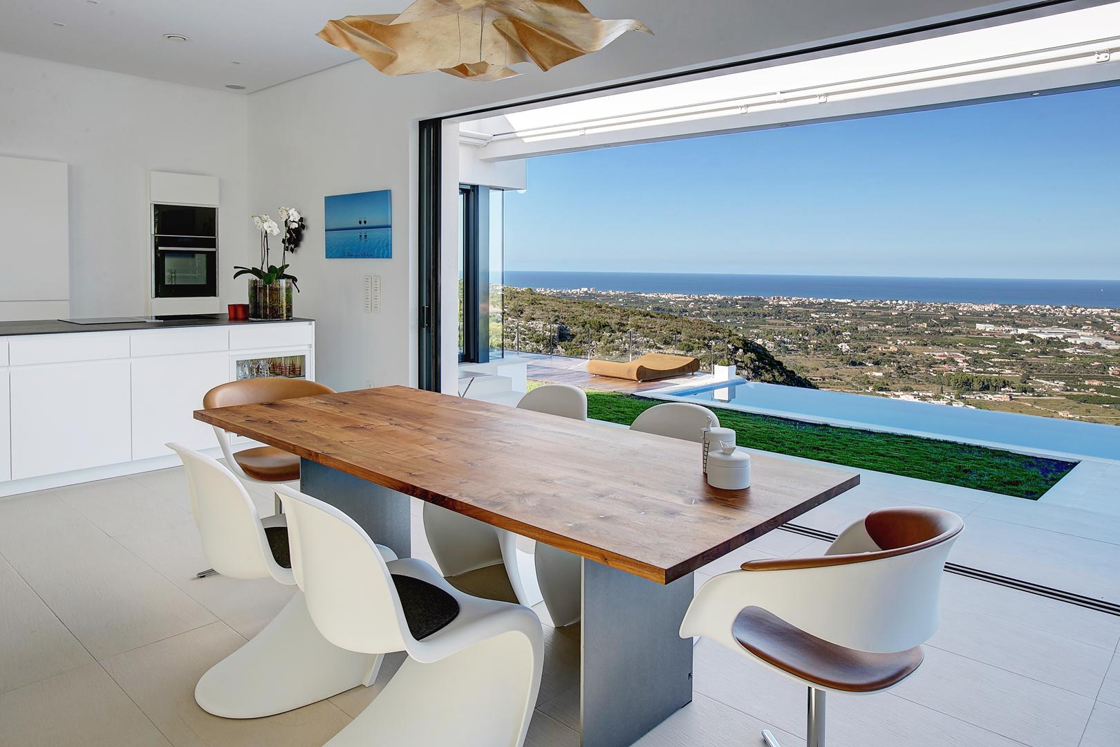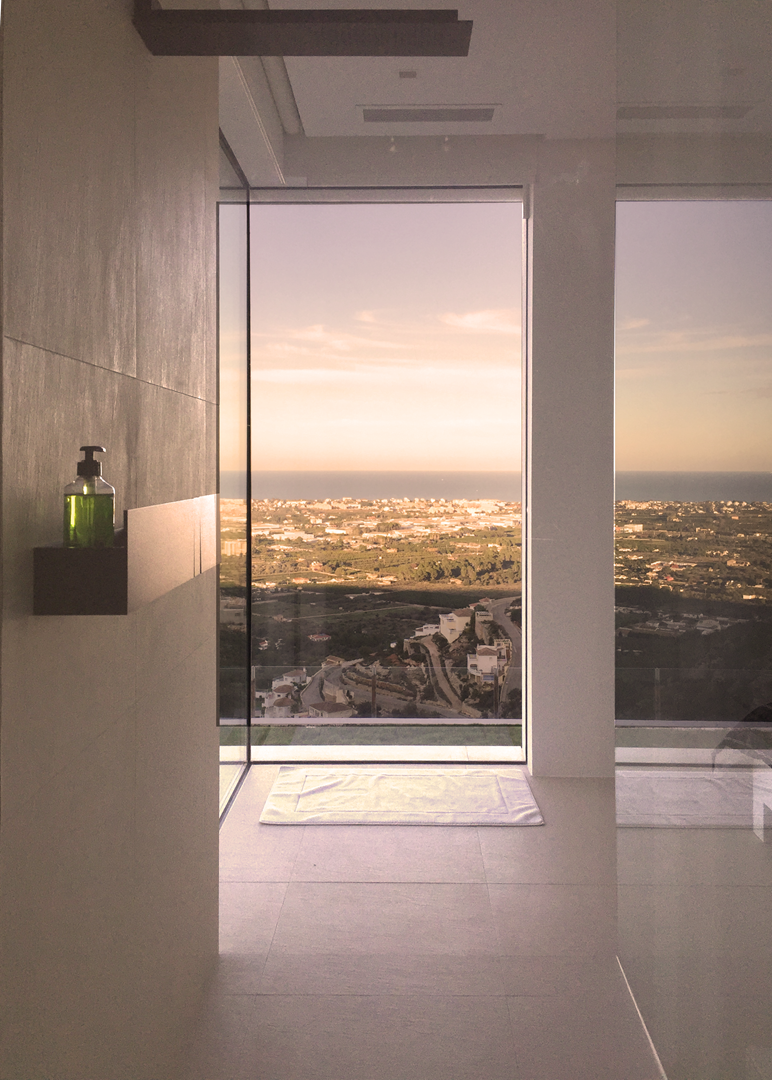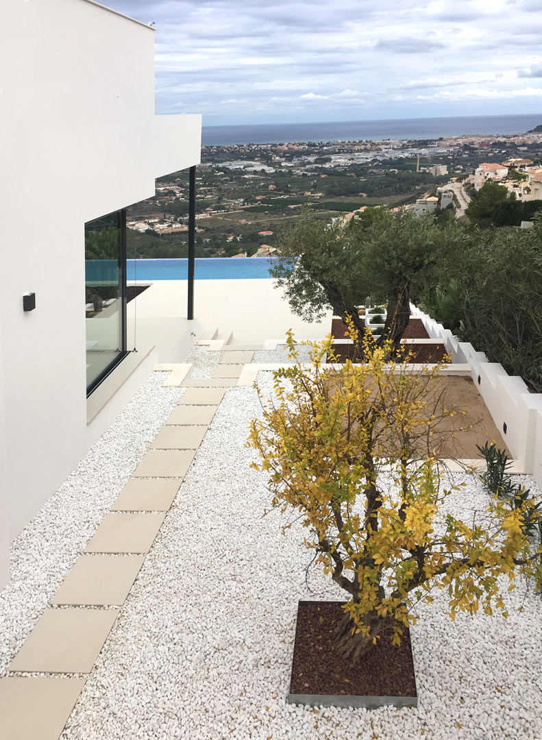 Este proyecto de obra nueva en Dénia se articula en torno a dos volúmenes claramente definidos, caracterizados por la especialización de las piezas y la creación de un espacio abierto y fluido. La distribución se concibió para optimizar la funcionalidad y la percepción espacial: se manipuló la altura de los techos para subrayar las actividades, con mayores alturas para las zonas de día (salón, comedor) y techos más bajos en las zonas de noche, creando un ambiente más contenido e íntimo.