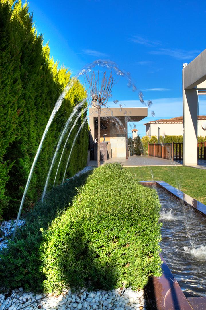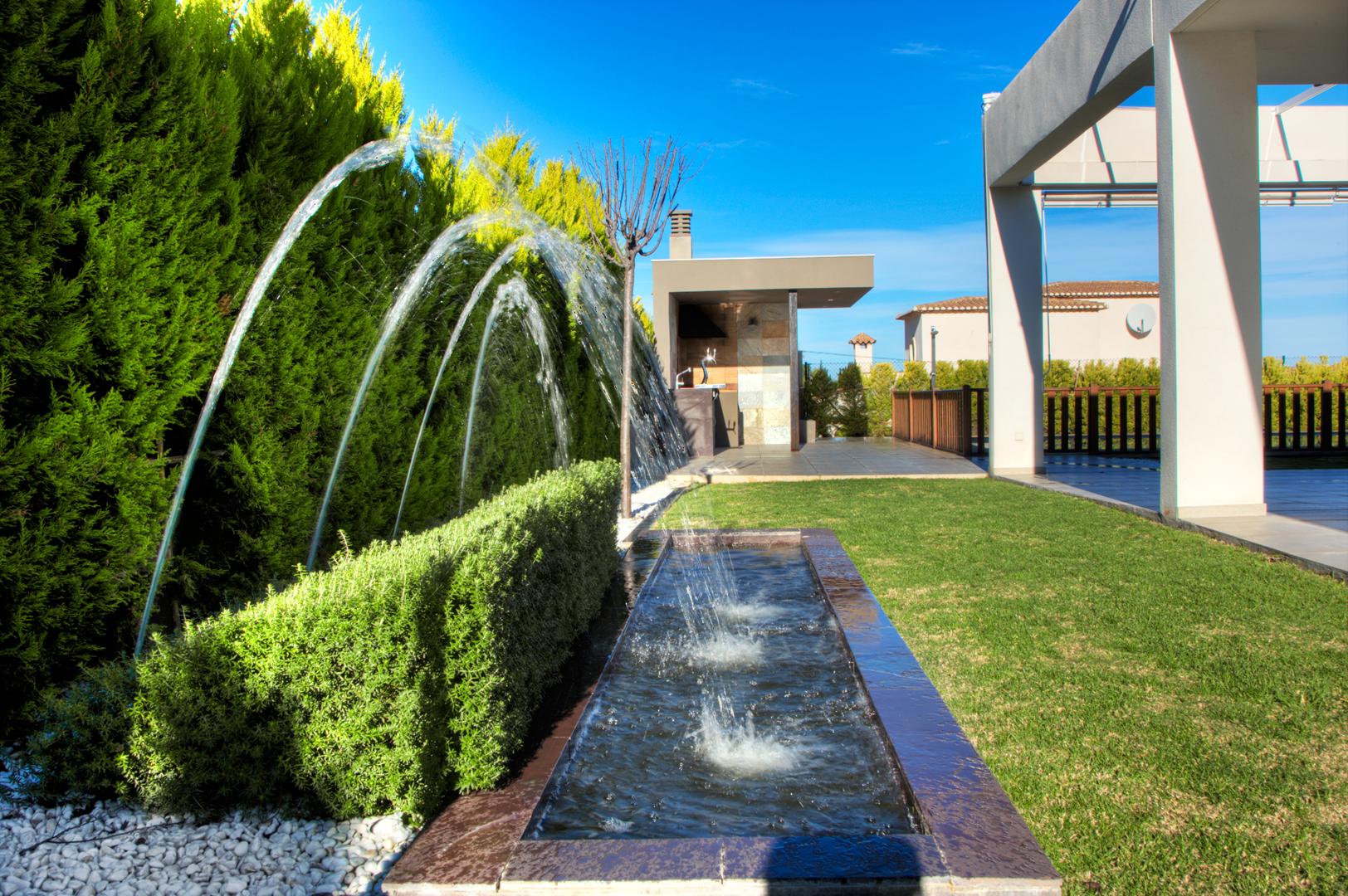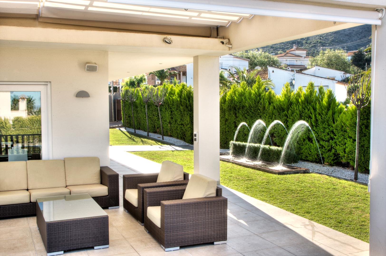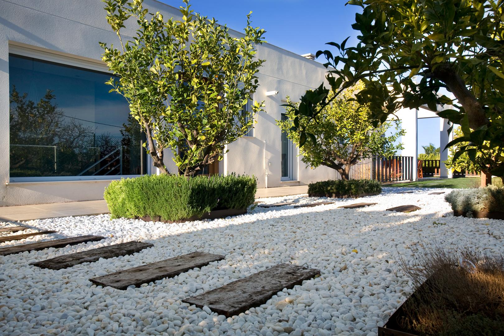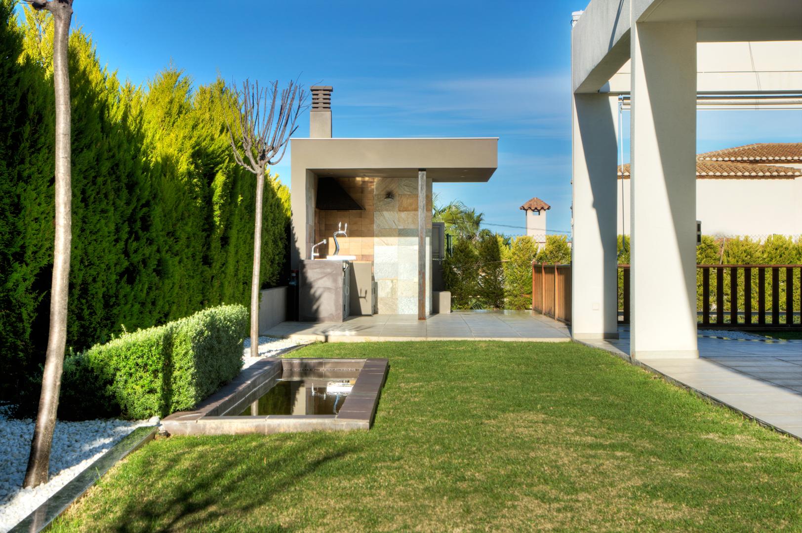 A la vivienda se accede a través de la entrada que marca una clara separación entre la zona de descanso —comunicada con el exterior mediante enormes ventanales y un espacioso porche— y el resto de la casa, orientada hacia la tranquilidad de los jardines, donde se integraron diversos ejemplares de bonsáis. En el exterior, el diseño se completa con una cómoda terraza con una estructura de esqueleto y toldos plegables, además de una cocina para disfrutar al aire libre durante los meses de verano.